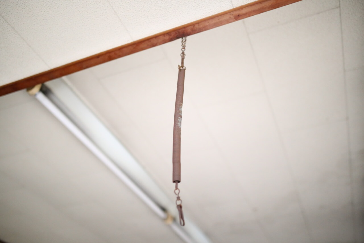 その名残りで、今も天井から吊るすために付けられたバネが垂れ下がっています。