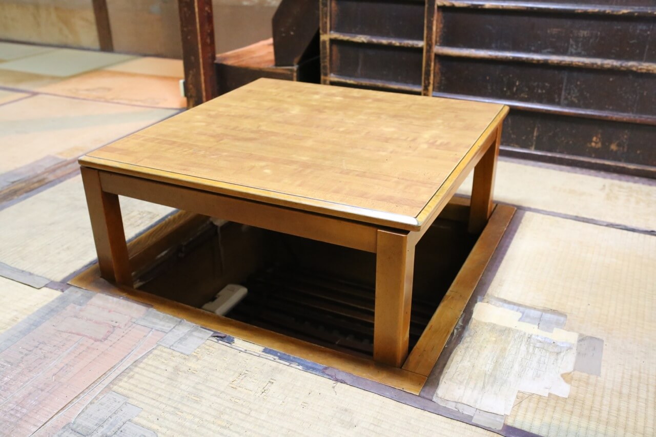 居間のテーブルは、昔ならではのつくりをした掘り炬燵があります。