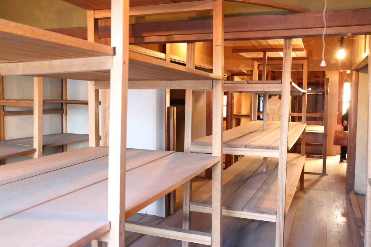 二階には、木でつくった棚が全面的にずらりと並んでいます。